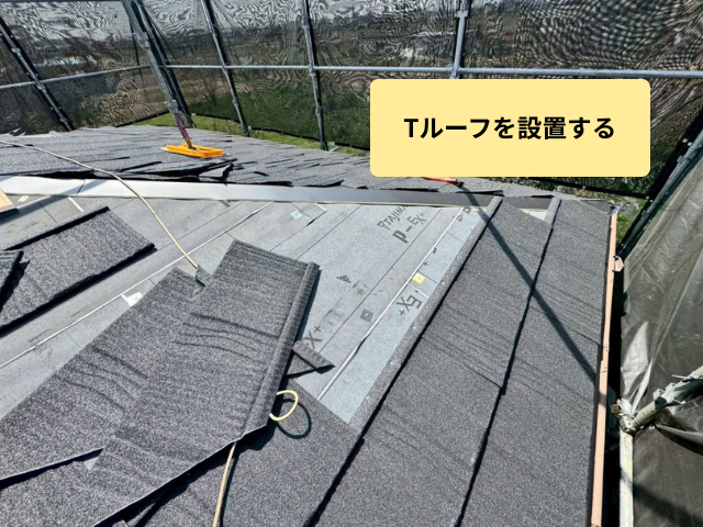 新しい屋根材を張る: 防水シートの上に、軽量で高性能なTルーフを重ねて固定し、棟板金も新しく設置します。