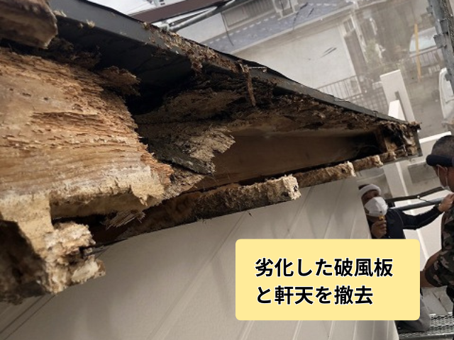 劣化が激しい破風板と軒天を、手作業で丁寧に撤去していきます。