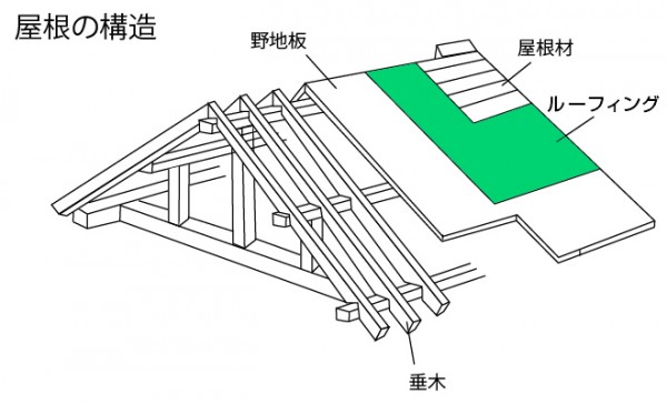 屋根の構造としては、垂木と呼ばれる屋根の骨の上に、野地板と呼ばれる屋根の下地があります。