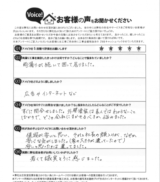 - 手抜きしないで、雨漏りのないように良心的にやってくれそうだと思ったから