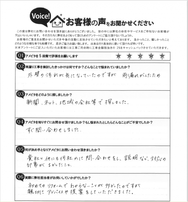 - 外壁の汚れがきになっていたのですが、雨漏れがしたため