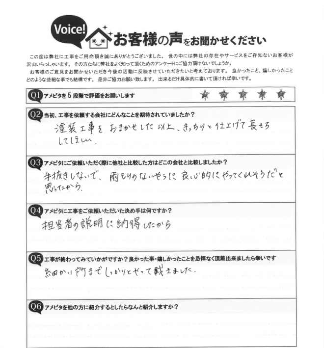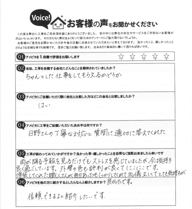 松戸市中矢切のお客様へ雨漏り修理工事のご提案!アンケートをご紹介します