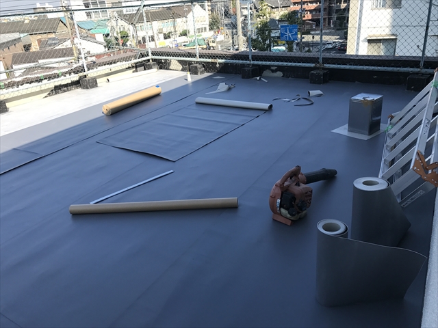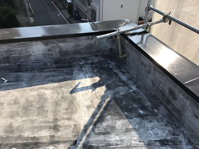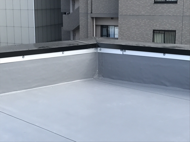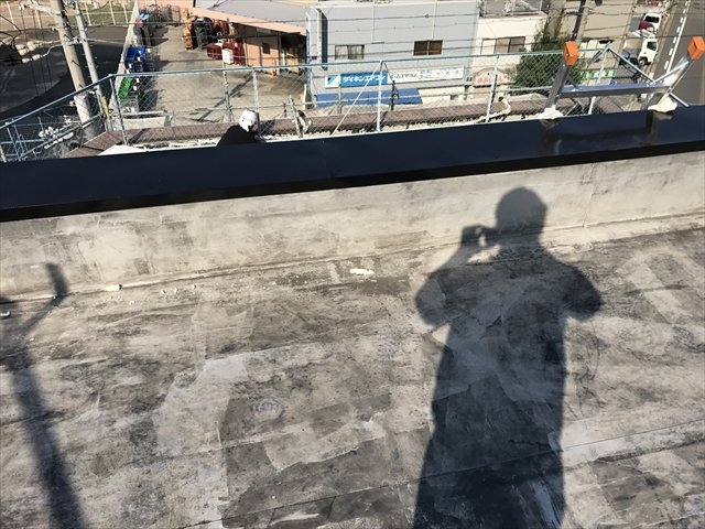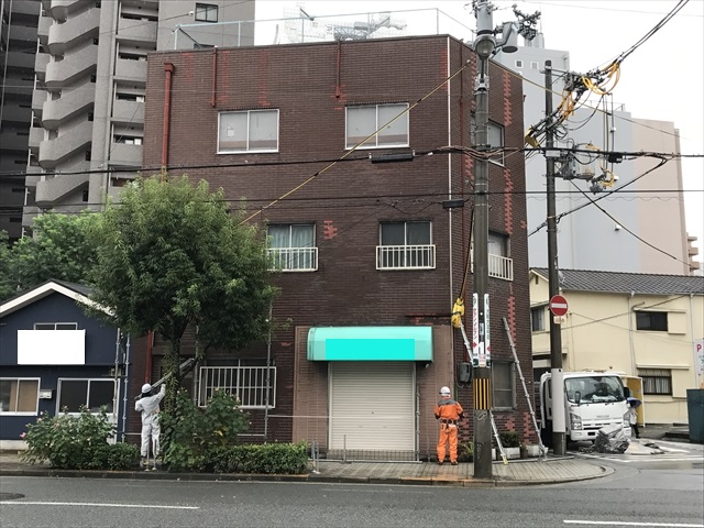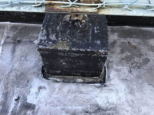 建物自体は築40年の鉄筋コンクリートの3階建てになります。大通りに面していて車通りも多いので建物が揺れやすい環境ではあります。鉄筋コンクリート造の建物の場合、クラックが生じてしまうと内部にある鉄筋へ影響を与えてしまう事で、錆びを発生させ、鉄筋の効力をゼロにしてしまいます。鉄筋は引っ張る力に強く、コンクリートの圧縮力のつよさと併せて強靭な強さを発揮することが出来ます。しかし鉄筋が全く使い物にならなくなってしまうと、コンクリートの圧縮力の力しか発揮させる事しかできません。また、鉄筋コンクリート内部に水が侵食する事で、水運の膨張と膨れを繰り返してしまい破損につなげてしまいます。鉄筋コンクリート造の構造体が古くなると中性化してしまうのは、クラックによる雨水浸透が大きな原因です。クラックをいかに早く防ぐかが、建物を長く持たせるためのポイントとなるのです。屋上部分にかんしては、汚れやひび割れが目立って見えます。雨漏りしているので早めの防水処理が必要になります。
